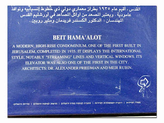 On the better part of King George Street (George V, from the British Mandate period) and not far from the Great Synagogue and some new Univeristy buildings, there is a lovely building that dominates a corner, and on the building there is this plaque.