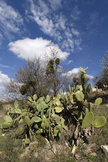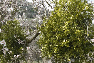 This is mistletoe among almond blossom. Mistletoe is a parasitic plant in that it lives on trees and sends its roots down into them and draws nutrients away from the host tree. In some cases it will eventually kill the host tree. Mistletoe is actually a hemiparasite in that it can also grow on its own and photosythesise materials. Usually though, it is a parasite and I imagine that when the village was occupied, the mistletoe would not have been allowed to grow so extensively.